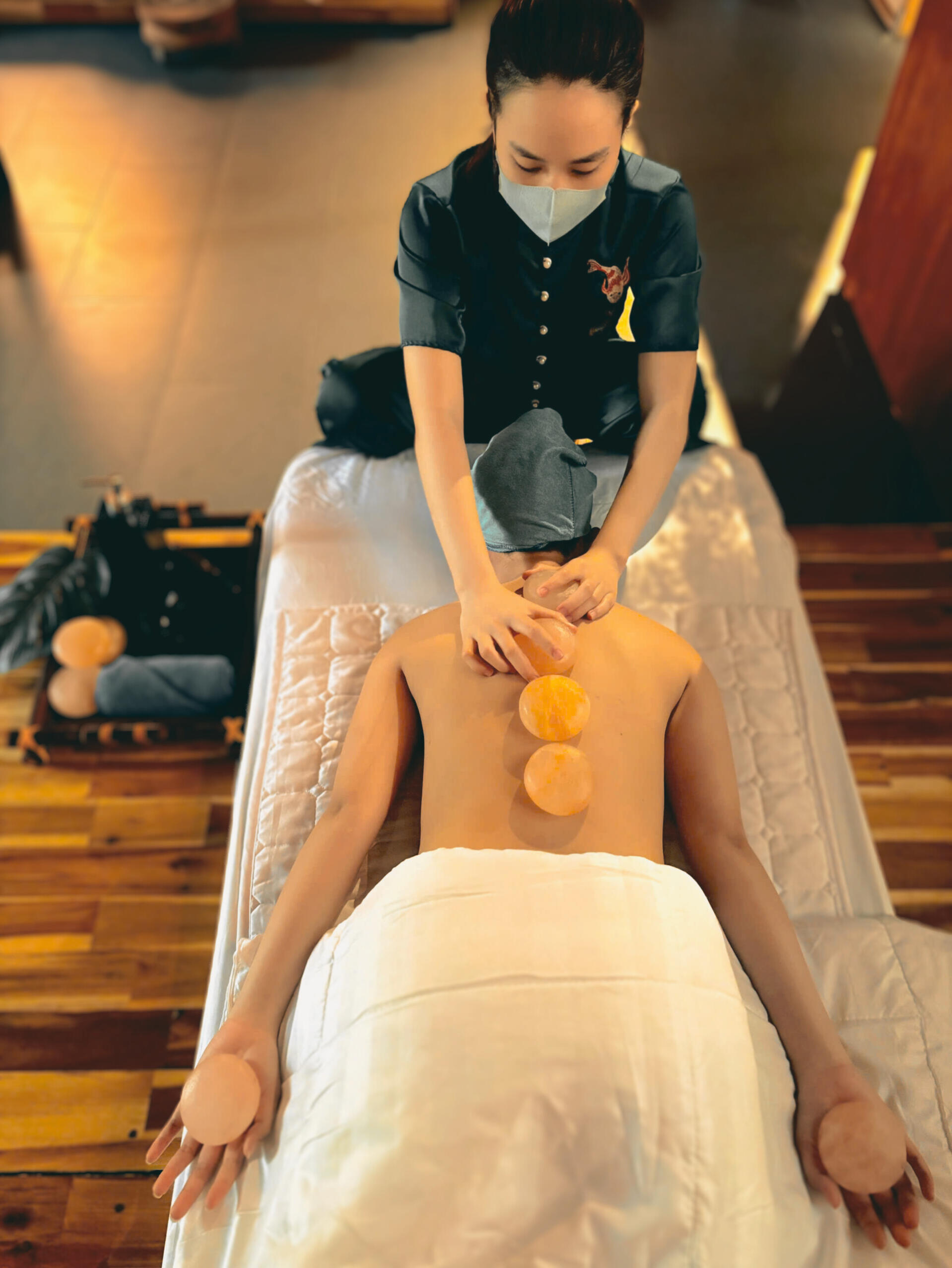 Sức nóng dịu nhẹ từ những viên đá bazan nguyên khối - được nung nóng đến nhiệt độ lý tưởng - nhẹ nhàng lan tỏa khắp cơ thể, hòa quyện cùng những chuyển động êm ái của bàn tay.